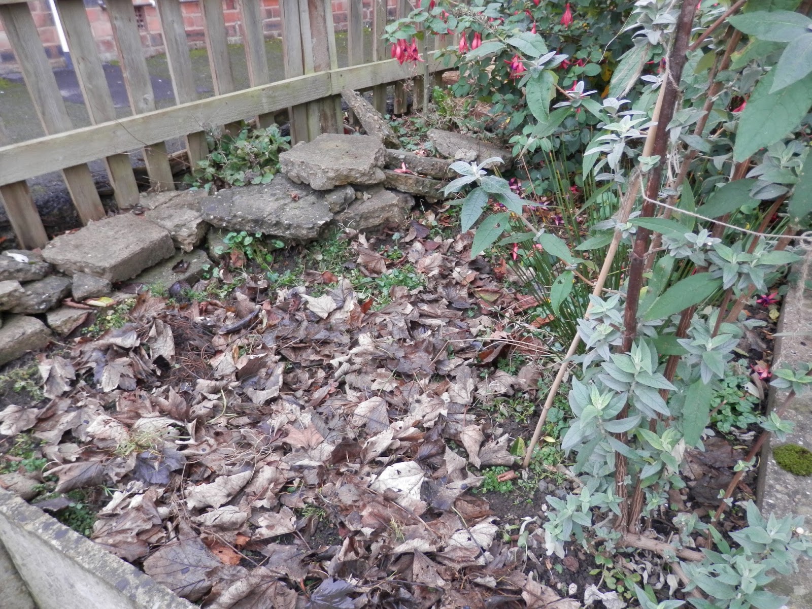 I've weeded the bed down the side of the house and then covered all the bare soil with fallen leaves I raked off the lawn. I read somewhere (I can't remember where!) about using fallen leaves as a mulch over winter, to protect bare soil from getting too weedy and to add nutrients to the soil as they break down. I'm giving it a try this year, I'm all for free soil improvement!